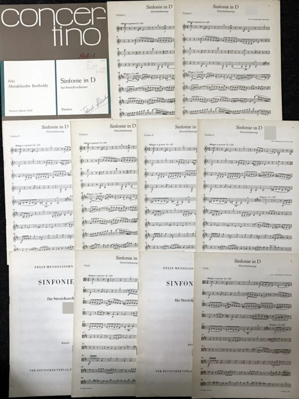 パート譜、ヴァイオリン 1 3点、ヴァイオリン 2 3点、ヴィオラ 2点、ヴァイオリンチェロ/コントラバス 2点。