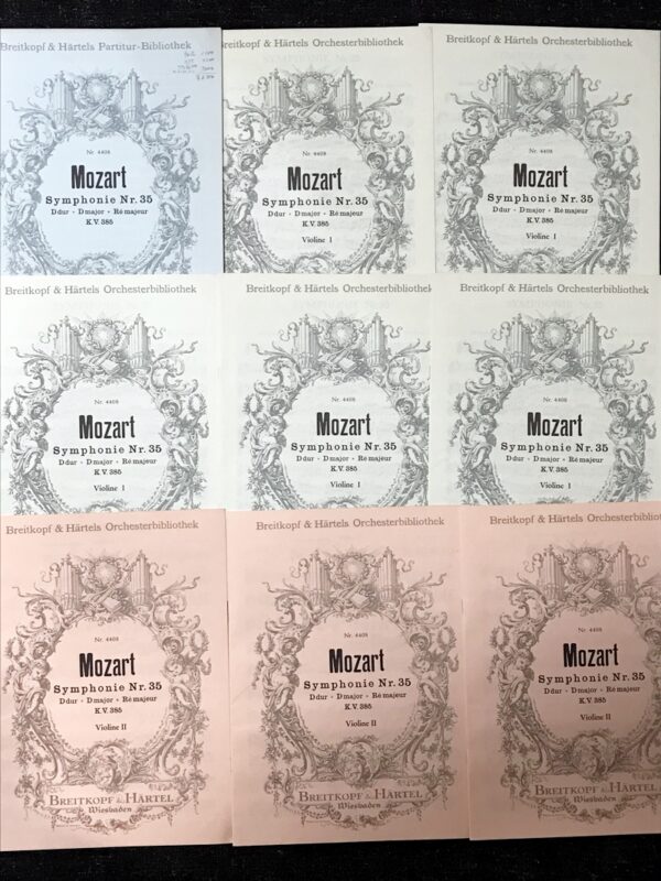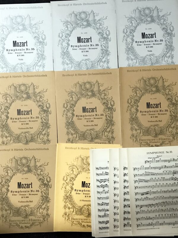 パート譜、ヴァイオリン 1 5点、ヴァイオリン 2 3点、ヴィオラ 3点、ヴァイオリンチェロ/コントラバス 4点、フルート 1/2、オーボエ 1/2、クラリネット 1/2、ファゴット 1/2、ホルン 1/2、トランペット 1/2、ティンパニ